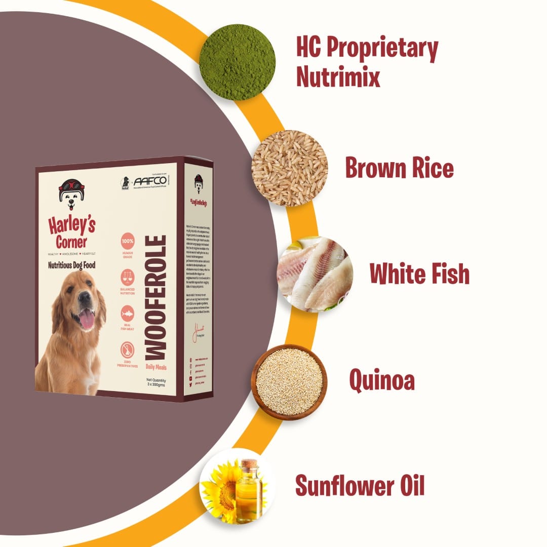 Wooferole is a delectable meal infused with the nutritious qualities of fish, brown rice, quinoa, pumpkin, algae calcium, and vegetables. It stands as a harmonious and complete dietary option that fosters the growth of sturdy bones and teeth, supports digestive well-being, and boasts an abundance of omega fatty acids. This nourishing meal not only enhances digestion but also elevates the health of your pet's skin and coat.